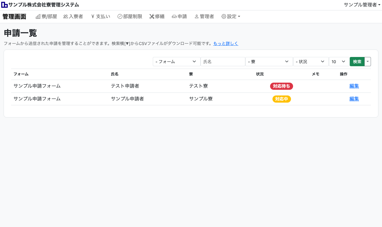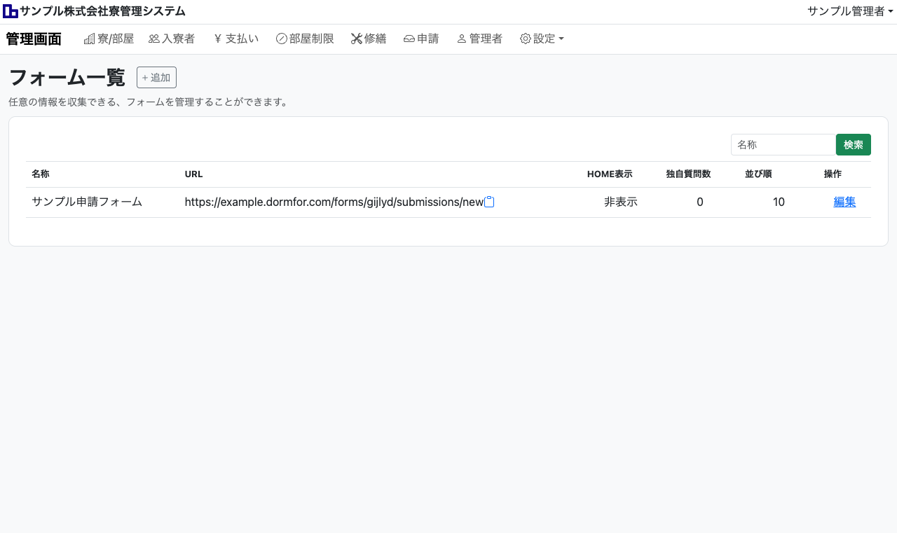 各種申請を受け付けるためのフォームを設定管理することができる画面です。フォームごとにURLが発行されるため、対象者にだけ告知して情報収集したり、広く入寮者向けに申請を受け付けたり、様々な使い方が可能です。